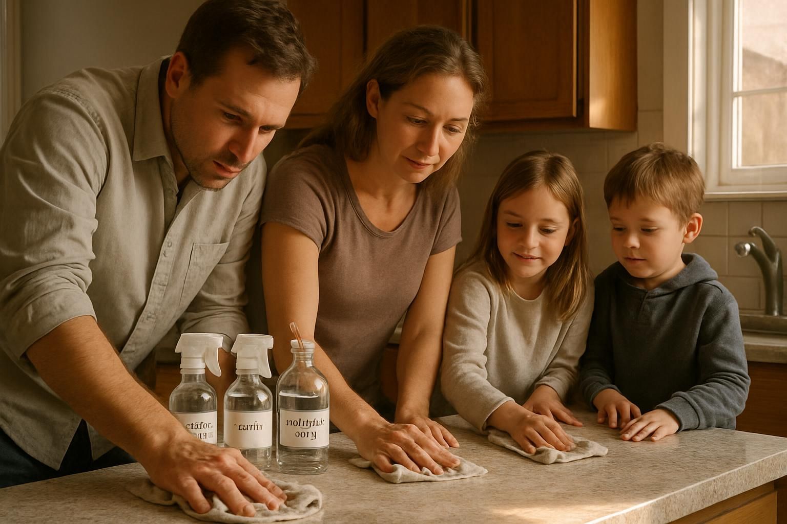 Spraying surfaces with white vinegar then wiping dry with microfiber cloths kills germs without harsh chemicals. Using disposable gloves protects hands from household cleaners while working.