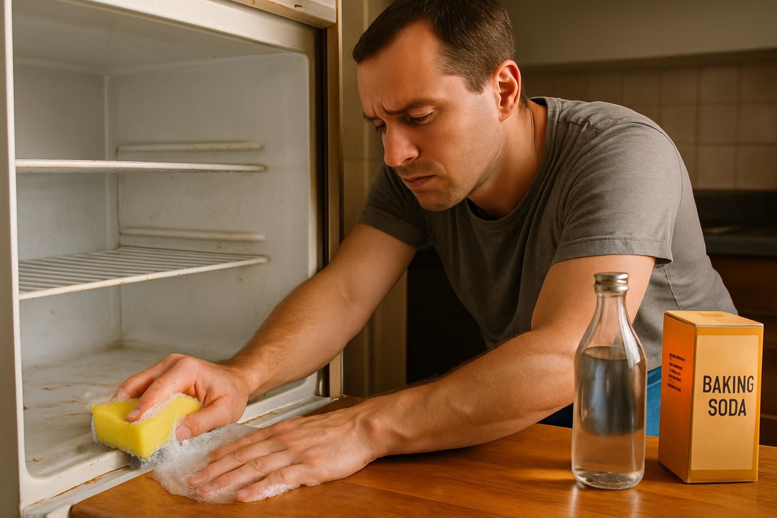 A vinegar spray tackles food buildup on refrigerator shelves and drawers quickly; homeowners can also vacuum refrigerator coils with a flat vacuum attachment to keep the appliance efficient.